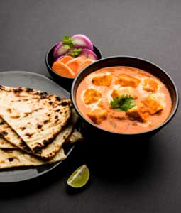 Butter chicken is a popular Indian dish consisting of tender chicken marinated in yogurt and spices, cooked in a creamy tomato-based sauce enriched with butter and cream. It has a rich, tangy, and mildly spiced flavor and is usually served with naan bread or rice.